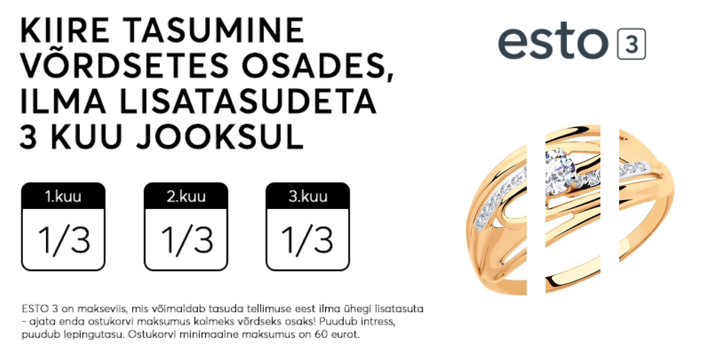 ESTO 3 on populaarseim uue põlvkonna makseviis. Jaota ostusumma mugavalt 3-ks võrdseks osaks. Saa täpselt, mida vajad ilma intressi, lisatasu ja sissemakseta.