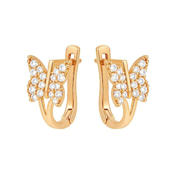 Armsad väiksemad valgete tsirkoonide ja liblikamotiiviga inglise lukuga kuldkõrvarõngad, mis on sobilikud ka lastele.