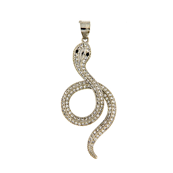Särav valgete ja mustade (silmad) tsirkoonidega kaunistatud ussikujuline hõberipats. Ripatsi aasa suurus on 5 mm.