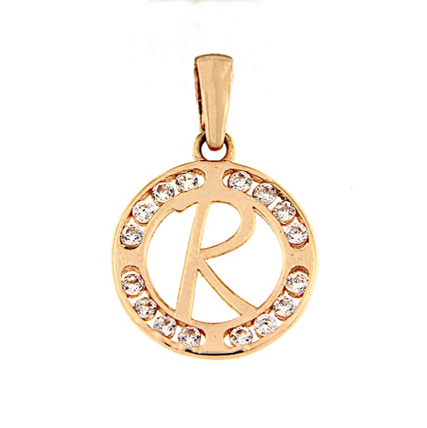 Valgete tsirkoonidega kaunistatud R-tähe ripats. Kuldripatsi läbimõõt on 11 mm.
