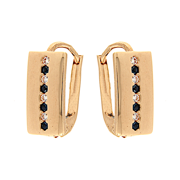 Väikeste mustade ja valgete tsirkoonidega kaunistatud kuldkõrvarõngad, mis sobivad igapäevaseks kandmiseks.