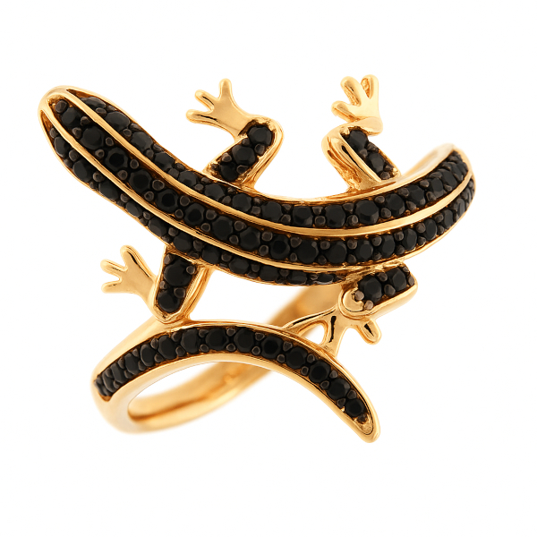 Eriline gekokujuline mustade ja roheliste (silmad) tsirkoonidega kaunistatud kuldsõrmus.