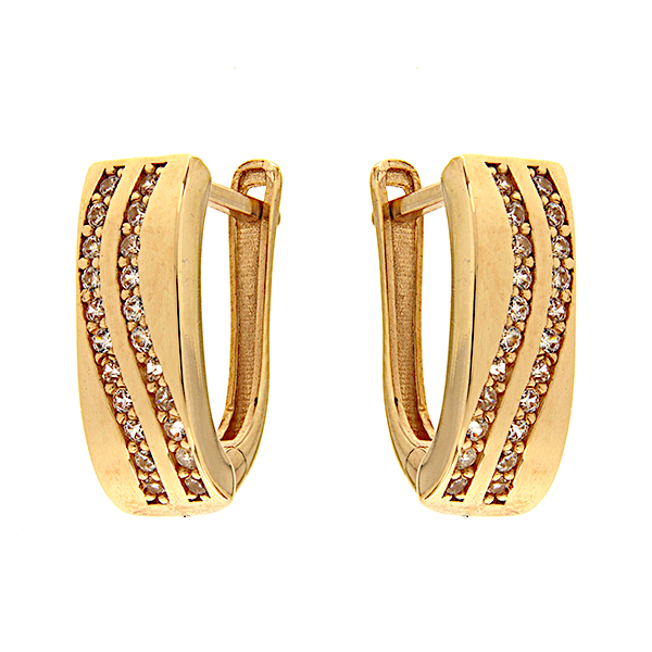 Säravate valgete tsirkoonidega kaunistatud inglise lukuga kuldkõrvarõngad.