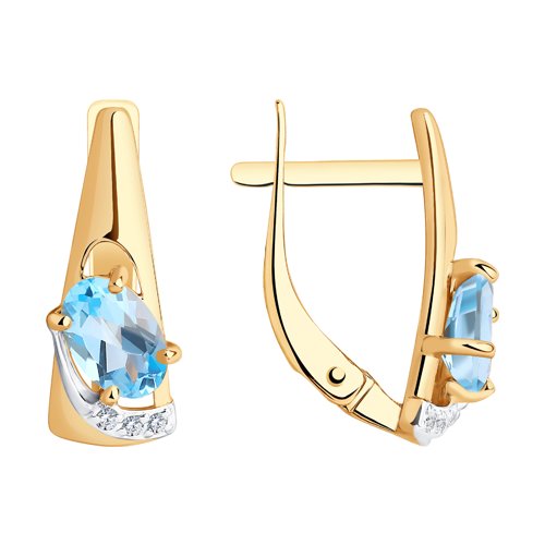 Kaunid inglise lukuga kuldkõrvarõngad, mis on kaunistatud helesiniste topaaside ja väikeste valgete tsirkoonidega.