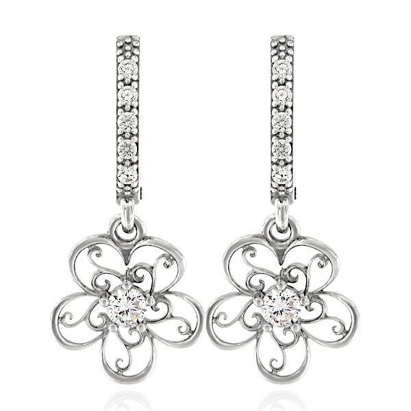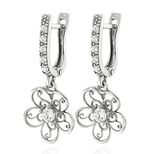 Särvavad rippuvad inglise lukuga hõbekõrvarõngad, mis on kaunistatud valgete tsirkoonidega.
