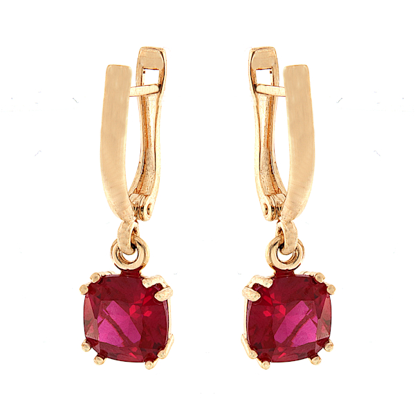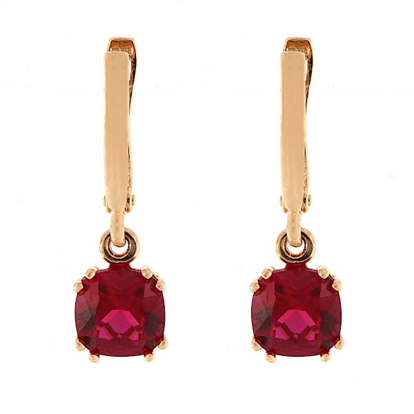 Säravate punaste neljakandiliste (7×7 mm) sünteetiliste rubiinidega kaunistatud inglise lukuga rippuvad kuldkõrvarõngad. Kõrvarõngad on sobilikud kandmiseks nii pidu- kui ka argipäeval.