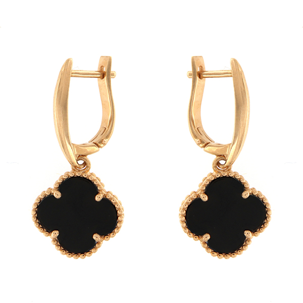Kaunid lillemotiivi ja oonüksitega kaunistatud rippuvad inglise lukuga kuldkõrvarõngad.