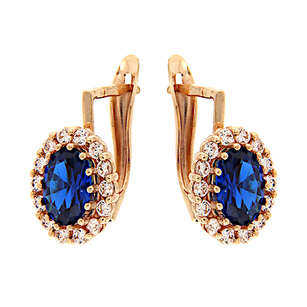 Luksuslikud inglise lukuga kuldkõrvarõngad, mis on kaunistatud siniste ja valgete tsirkoonidega.