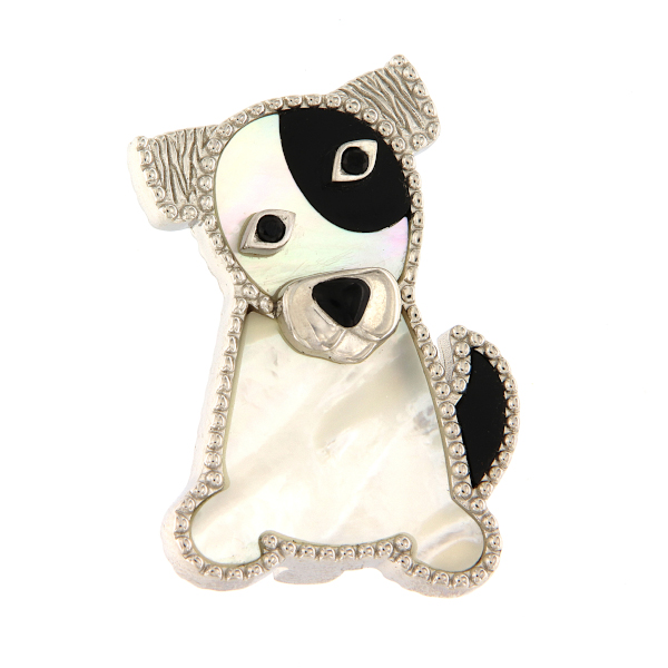Armas koerakujuline pärlmutri ja tsirkoonidega kaunistatud hõbepross.