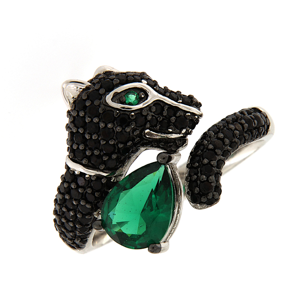Efektne pantrikujuline mustade ja roheliste tsirkoonidega kaunistatud hõbesõrmus suurusega 17,0.
