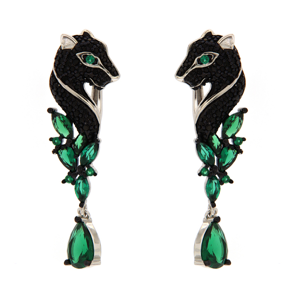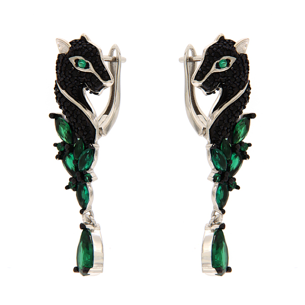 Efektsed pantrikujulised mustade ja roheliste tsirkoonidega kaunistatud rippuvad hõbekõrvarõngad. Kõrvarõngastel on mugav inglise lukk. Need hõbekõrvarõngad on eriti sobilikud pidulikuks sündmuseks.