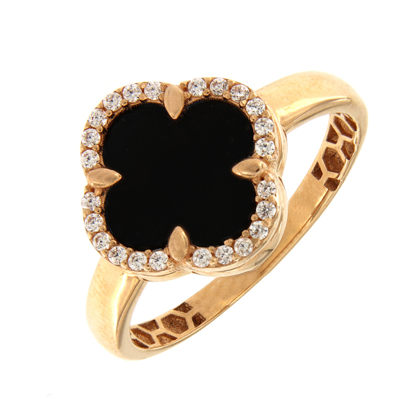 Kaunis ja pidulik lillemotiivi, tsirkoonide ja oonüksiga kaunistatud kuldsõrmus.