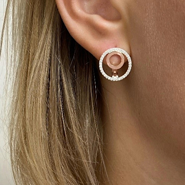Säravad valgete tsirkoonidega hõbekõrvarõngad. Kõrvarõnga osa detaile on kaetud õhukese kullaplaadiga (proov 375).