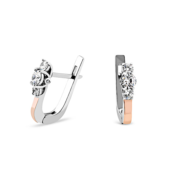 Säravad valgete tsirkoonidega hõbekõrvarõngad. Kõrvarõnga osa detaile on kaetud õhukese kullaplaadiga (proov 375).
