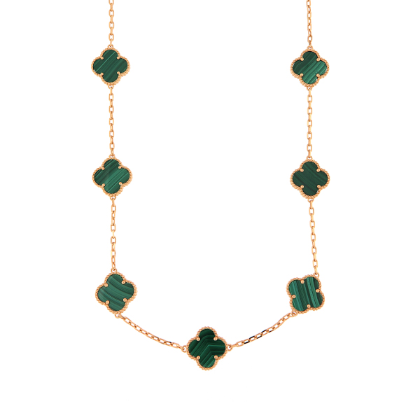 Eriline kullatud hõbedast lillemotiividega kaelaehe, mis on kaunistatud malahhiitidega. Kaelaketi pikkus on 44 cm.
