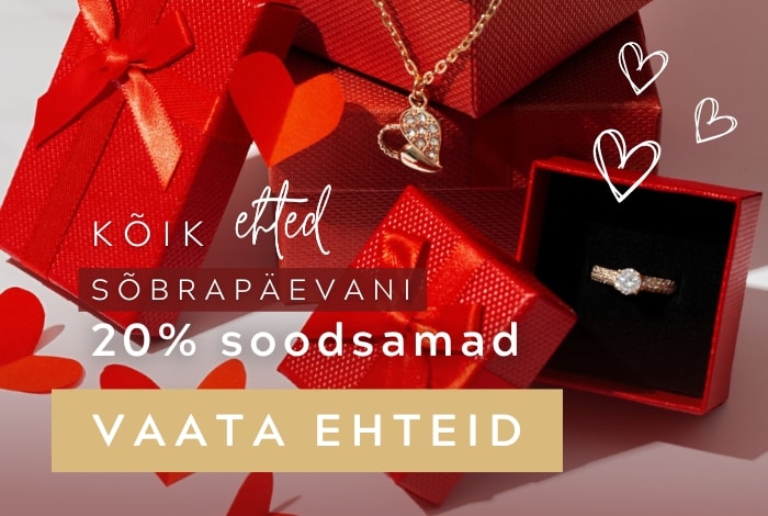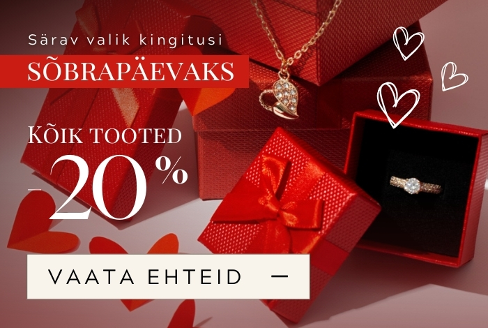 Tutvu ehete valikutega meie sõbrapäeva kingituste kategoorias. Kuni valentinipäevani on meie e-poes kõik alates 20 € tooted -20%. Leia oma naisele, tüdruksõbrale või kaaslasele sobiv kingitus ning väljenda oma tundeid kinkides ehteid. Vaata kõiki sõbrapäeva kingitusi.
